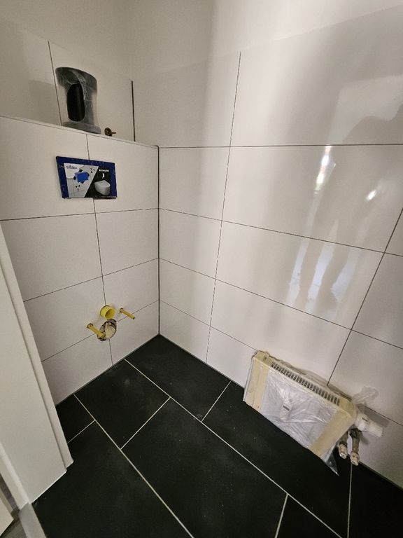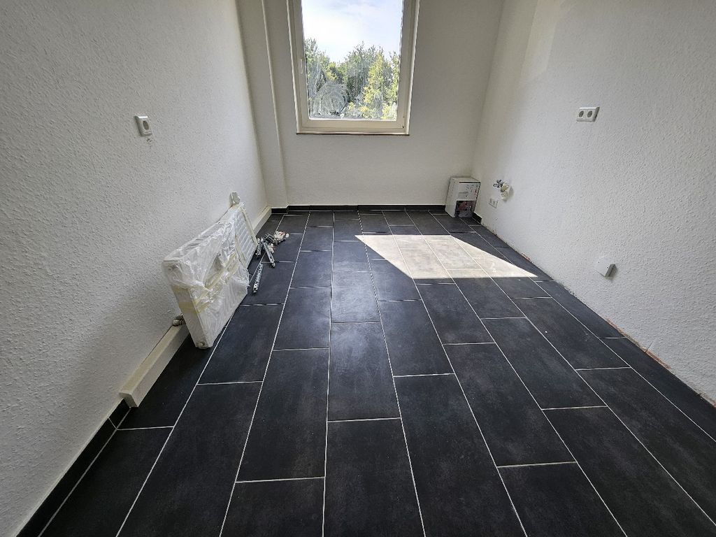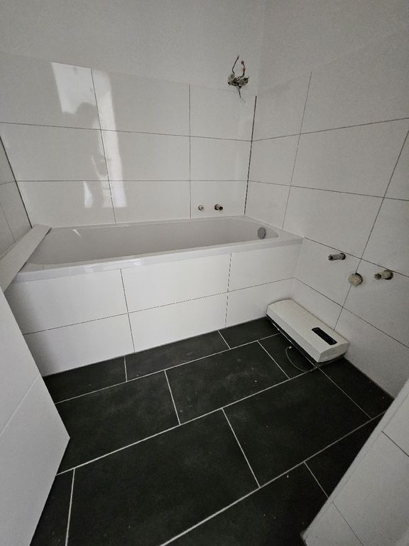 Die Modernisierungsarbeiten sind fast abgeschlossen. Das völlig erneuerte Badezimmer wird mit einer Badewanne und einem Waschbecken ausgestattet, während das separate WC mit wandhängendem WC und einem Waschbecken gestaltet wird. Beide Sanitärbereiche verfügen über weiße Wandfliesen und schwarze Bodenfliesen. Ebenfalls schwarz gefliest ist der Fußboden der Küche, während im Wohnzimmer, den beiden Schlafräumen und der Diele ein stylischer Laminatboden verlegt wurde. Die Wärmeversorgung erfolgt über eine erst vor 4 Jahren erneuerte Gaszentralheizung, die Kunststofffenster sind doppelt verglast.