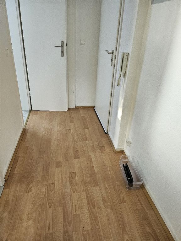 Das Badezimmer ist mit weißen Bodenfliesen und weißen Wandfliesen gefliest und mit einer Dusche, einem Waschtisch, einem wandhängenden WC sowie einem Handtuchheizkörper ausgestattet. In allen weiteren Wohnräumen ist ein heller Laminatboden verlegt. In der Küche befindet sich eine Einbauküche. Die Wohnung verfügt über doppelt verglaste Kunststofffenster, die Wärmeversorgung erfolgt mittels Wandheizkörpern über eine Gaszentralheizung. Zur Wohnung gehört ein eigener Kellerraum, eine Waschmöglichkeit gibt es auch in der Gemeinschaftswaschküche.